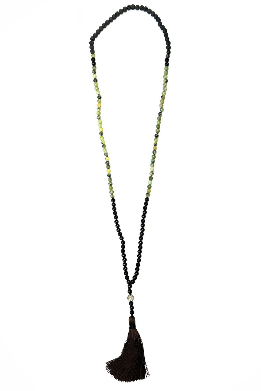 • Lava Diffuser Necklace, 6mm Serpentine Verdite and Black Agate with Silk Tassel
